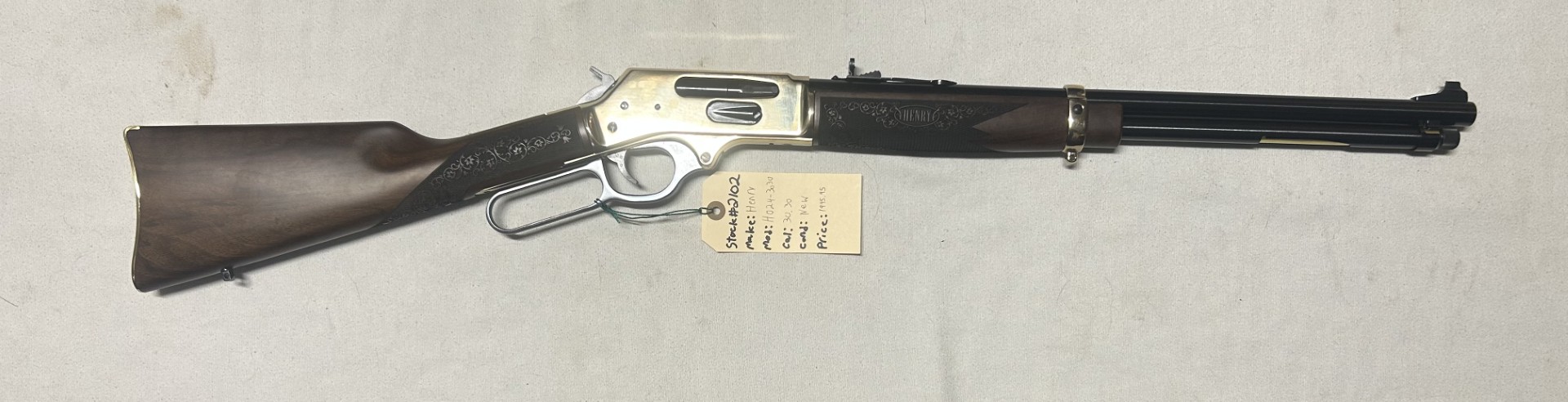 Home / Shop / New Rifles CenterFire / Henry / Henry 30-30 #2102 Henry 30-30 #2102$1,99595 Henry 30-30 #2102 quantity Add to cart SKU: 2102 Categories: 30-30, Henry, New Rifles CenterFire Tag: 2102 Product ID: 13383 Description Reviews (0) Description Model:H024-3030 Lever Action Engraved walnut stock 20” barrel with open sights Gold receiver and hardware Side gate load NEW Reviews There are no reviews yet. Be the first to review “Henry 30-30 #2102” Cancel replyYour email address will not be published. Required fields are marked *Name * Email * Save my name, email, and website in this browser for the next time I comment. Your rating * Rate… Perfect Good Average Not that bad Very poor Your review * I agree that my submitted data is being collected and stored. For further details on handling user data, see our Privacy Policy Related products Out of stock CVA 45-70 /stock #99 $61495 Ruger 270 win / Stock # 76 $92295 Out of stock Browning 308 $1,29895