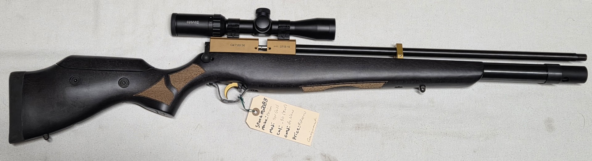 Home / Shop / Air Rifles / Orion .30 (7.62) #2083 Orion .30 (7.62) #2083$1,20000 Orion .30 (7.62) #2083 quantity Add to cart SKU: 2083 Category: Air Rifles Tag: 2083 Product ID: 13341 Description Reviews (0) Description Model:SPR Gold Bolt Action Black wood stock 20” barrel hawke 3x7x32 black hard case AS NEW CONSIGNMENT Reviews There are no reviews yet. Be the first to review “Orion .30 (7.62) #2083” Cancel replyYour email address will not be published. Required fields are marked *Name * Email * Save my name, email, and website in this browser for the next time I comment. Your rating * Rate… Perfect Good Average Not that bad Very poor Your review * I agree that my submitted data is being collected and stored. For further details on handling user data, see our Privacy Policy Related products Crosman .177cal $2395 Hatsan .177 $19500 Ruger .177 $36395