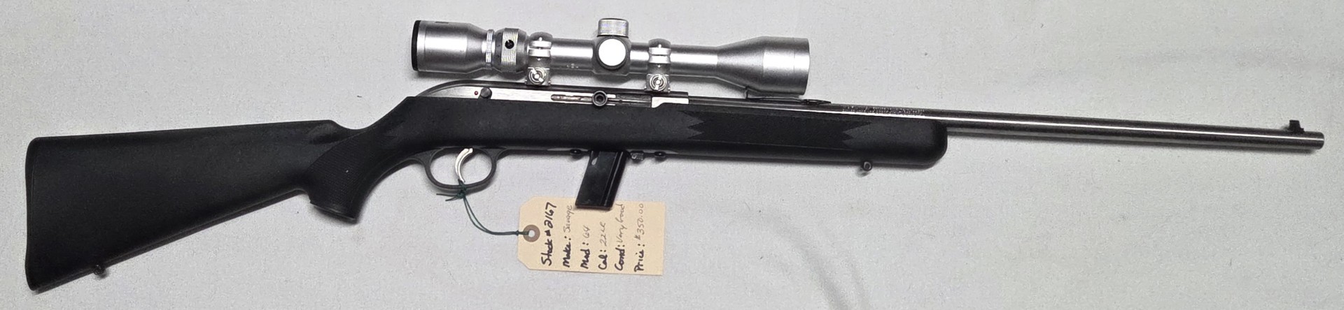 Home / Shop / Used Rifle Rimfire / Savage / Savage 22LR #2167 Savage 22LR #2167$35000 Savage 22LR #2167 quantity Add to cart SKU: 2167 Categories: 22, Savage, Used Rifle Rimfire Tag: 2167 Product ID: 13540 Description Reviews (0) Description Model:64 Semi Auto Black synthetic stock silver barrel Bushnell 3-9×40 scope open sights VERY GOOD CONSIGNMENT Reviews There are no reviews yet. Be the first to review “Savage 22LR #2167” Cancel replyYour email address will not be published. Required fields are marked *Name * Email * Save my name, email, and website in this browser for the next time I comment. Your rating * Rate… Perfect Good Average Not that bad Very poor Your review * I agree that my submitted data is being collected and stored. For further details on handling user data, see our Privacy Policy Related products Winchester Super X $3095 22LR Shotshell $695 Winchester 22 win mag $2195
